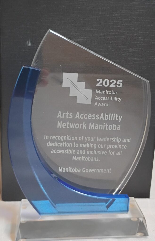 On July 23, 2025 Arts AccessAbility Network Manitoba received the Manitoba Accessibility Award, in recognition of AANM’s work and dedication to accessibility in the arts.